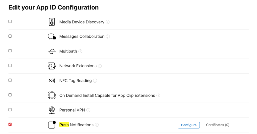 4. On the screen that appears, scroll down to Push Notifications, select the check mark and click on "Configure"