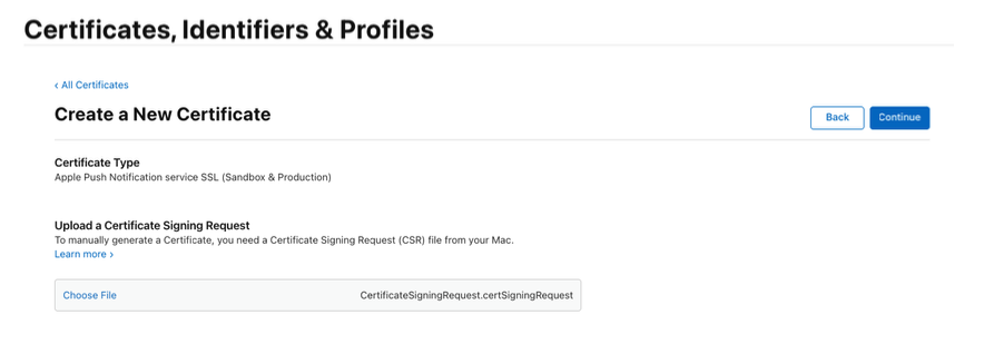 6. Click on the "Choose File" button and select the CSR (Certificate Signing Request) file you have downloaded, to enable the "Continue" button
